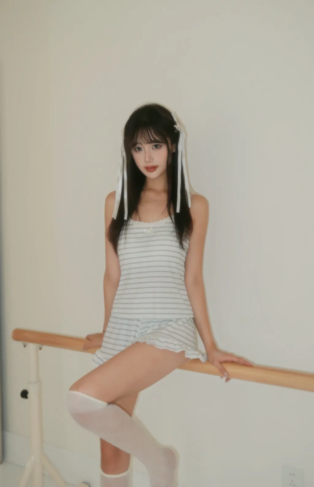 Lazy Stripe|宅日舒適條紋吊帶睡衣套裝-灰色親膚柔軟的棉感布料 透氣不悶熱固定式胸墊和可調節肩帶設計彈性鬆緊腰圍不勒肚下身微荷葉邊褲腳 增添甜美感胸口小蝴蝶結點綴 簡單又可愛寬鬆版型 S~L 身形皆可穿著 舒適不貼身顏色:藍色、灰色尺寸:M (手工測量,誤差±3cm皆正常範圍)(商品皆為實拍,與原色差異極小,室內光與戶外陽光顏色下略有些微差異,特殊色每個人認知能力不同,請三思後下單)