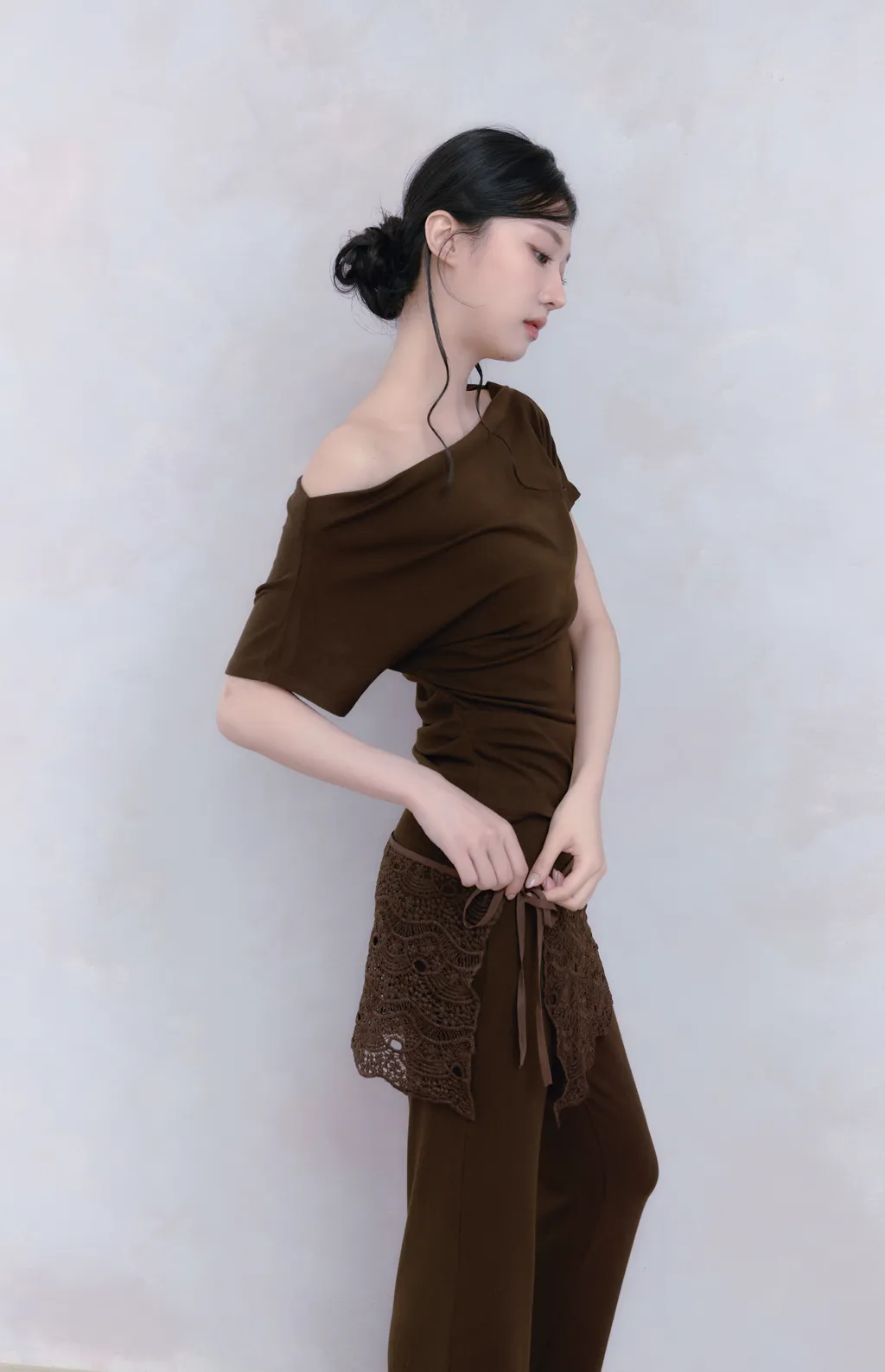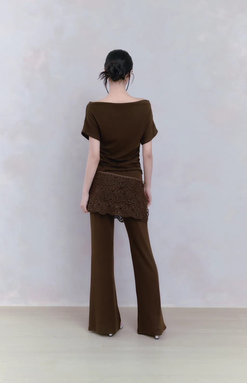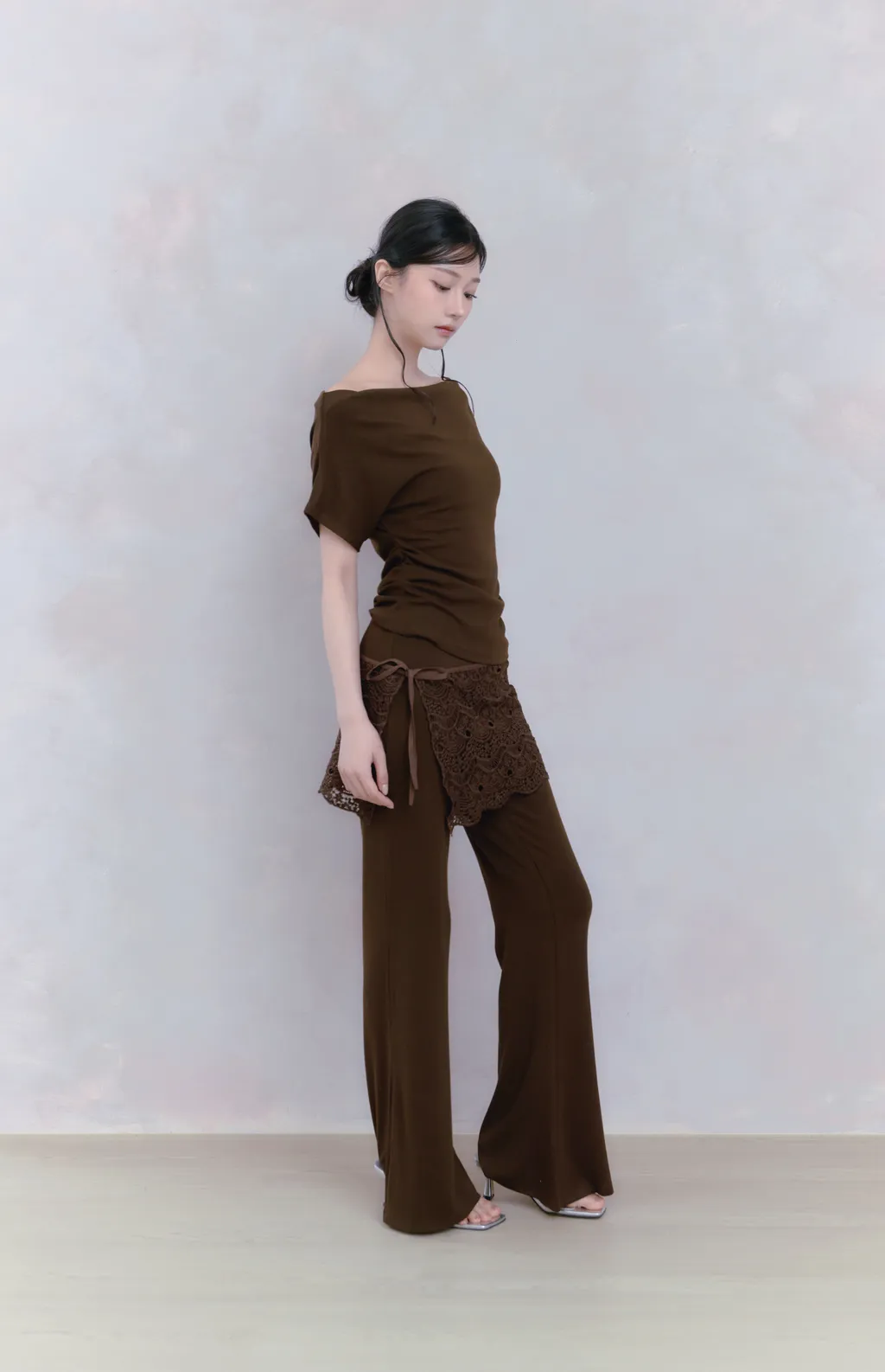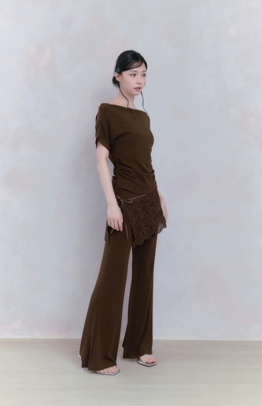 Off Drape Set|一字領抽蕾絲綁帶微喇長褲套裝-深橄欖棕