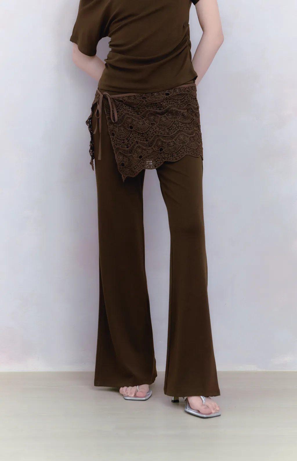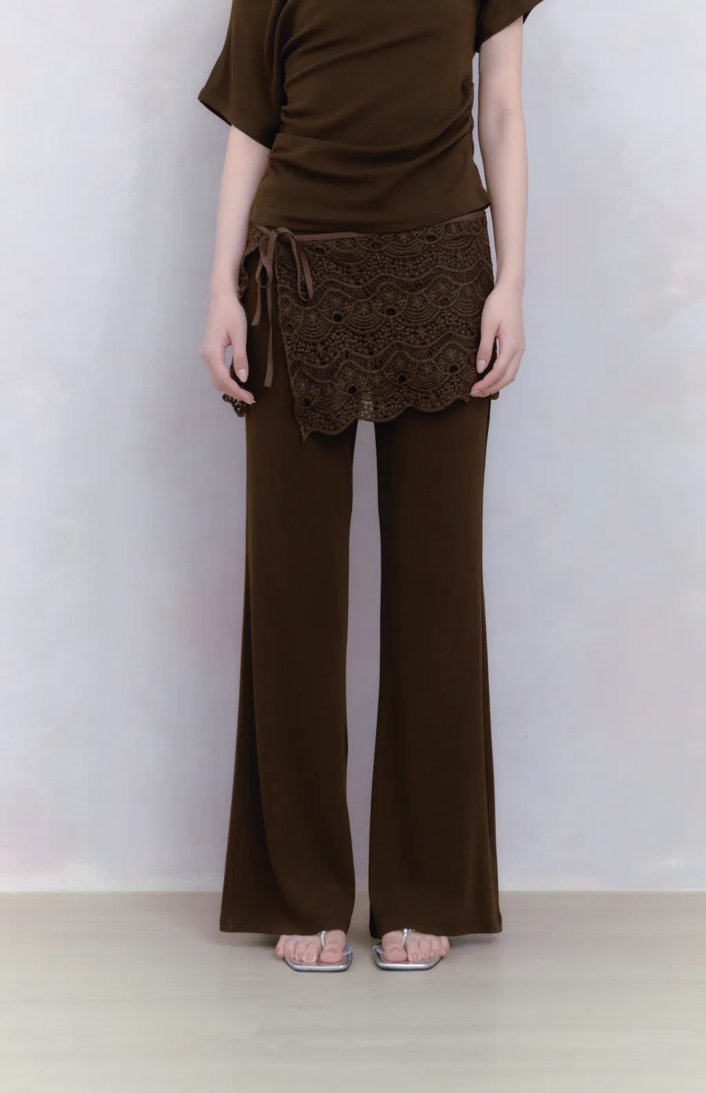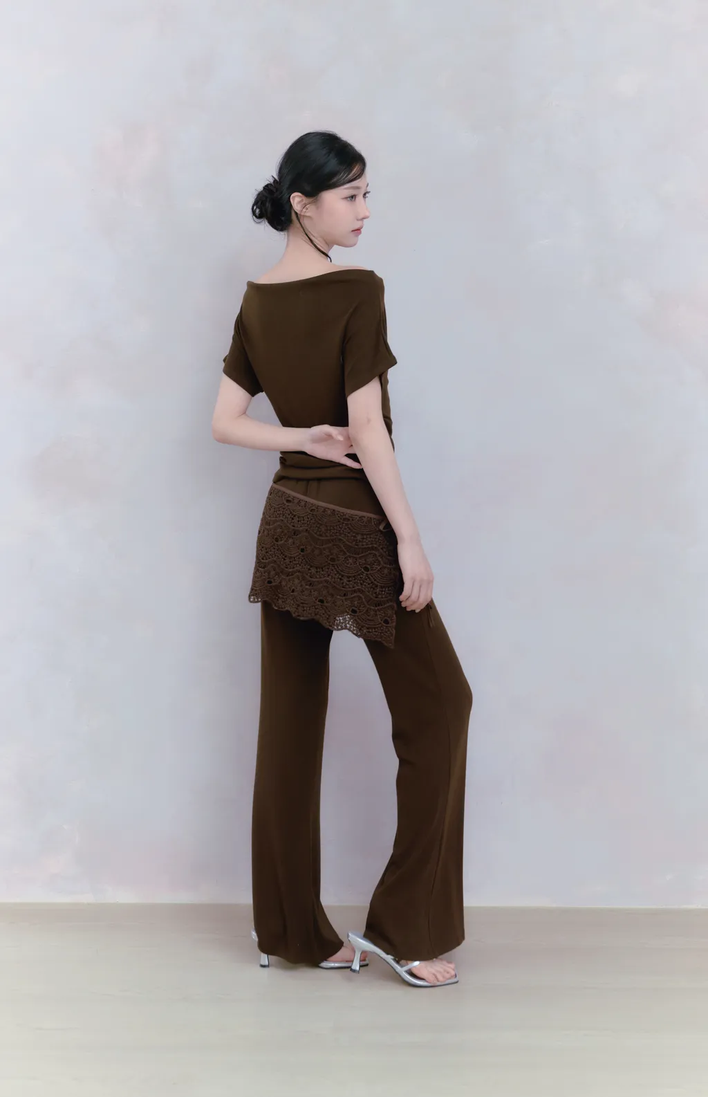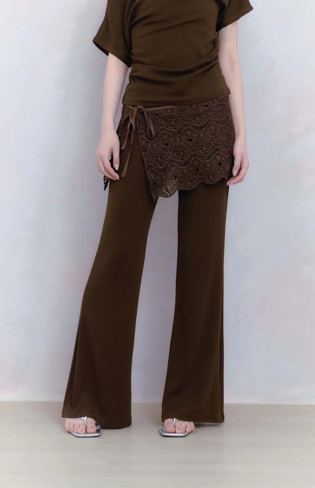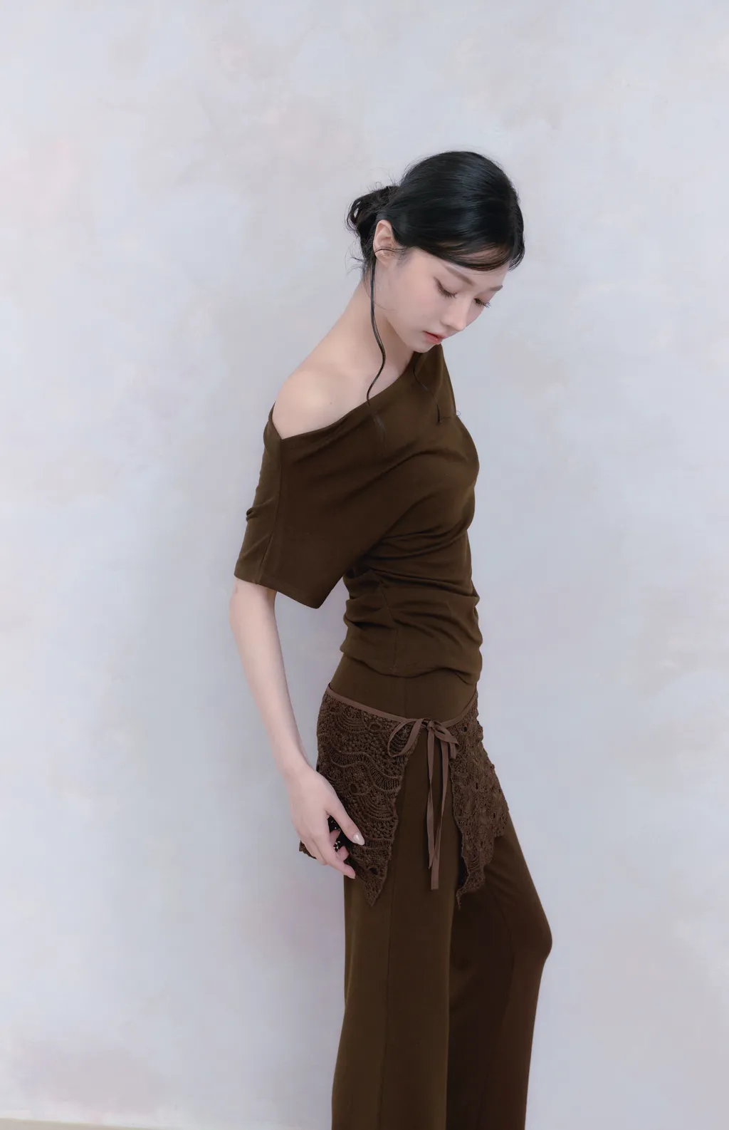 Off Drape Set|一字領抽蕾絲綁帶微喇長褲套裝-深橄欖棕