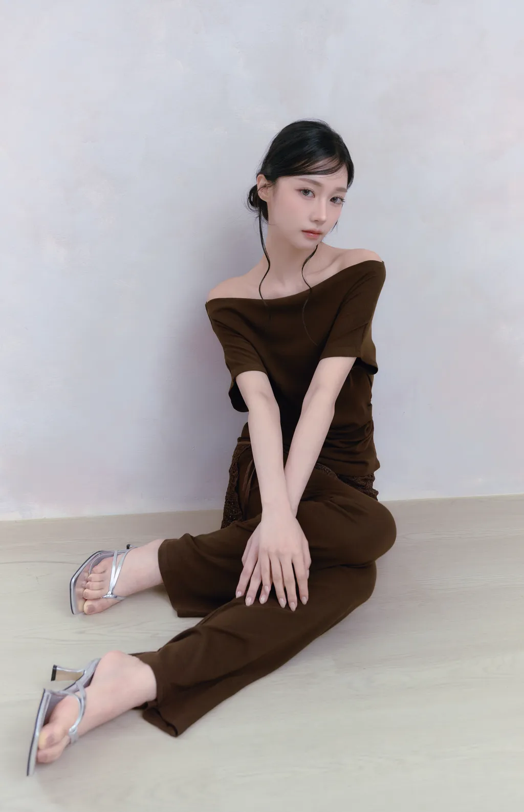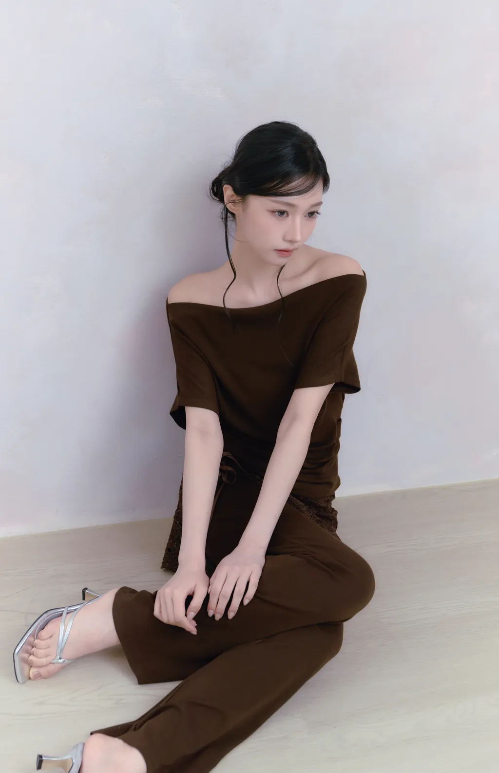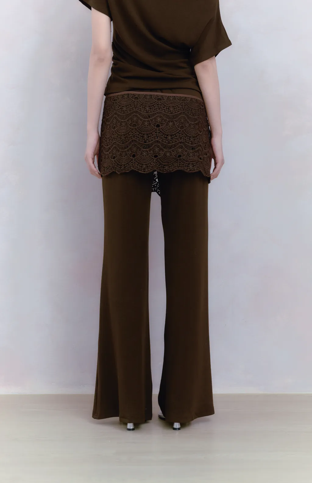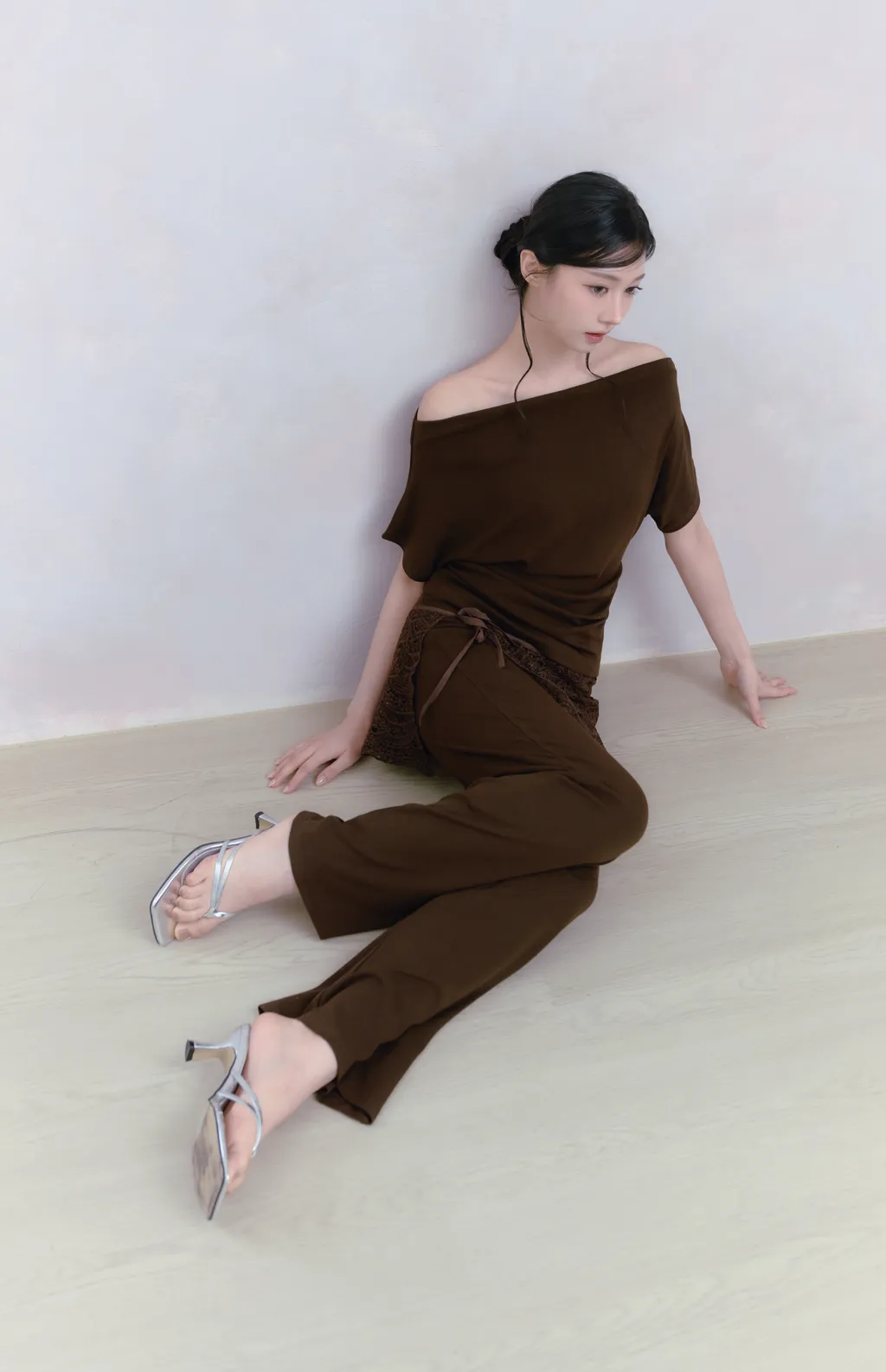 Off Drape Set|一字領抽蕾絲綁帶微喇長褲套裝-深橄欖棕