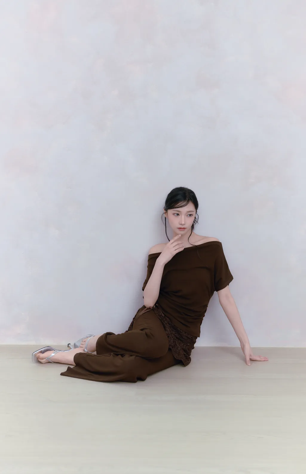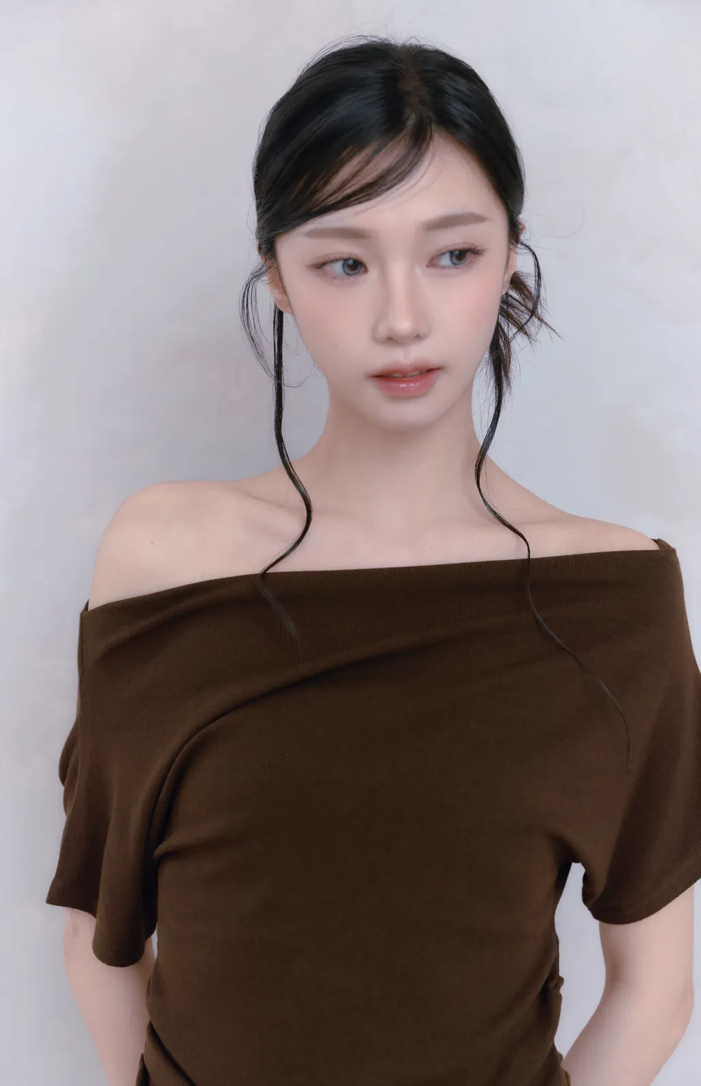 上衣(無胸墊)採寬版一字領口設計 橫跨肩膀自然露出鎖骨與肩部線條