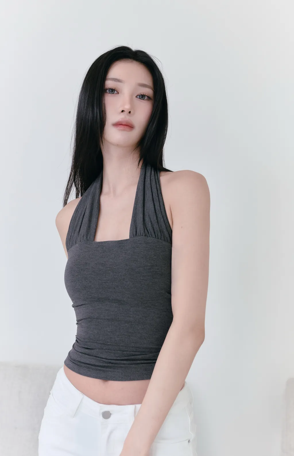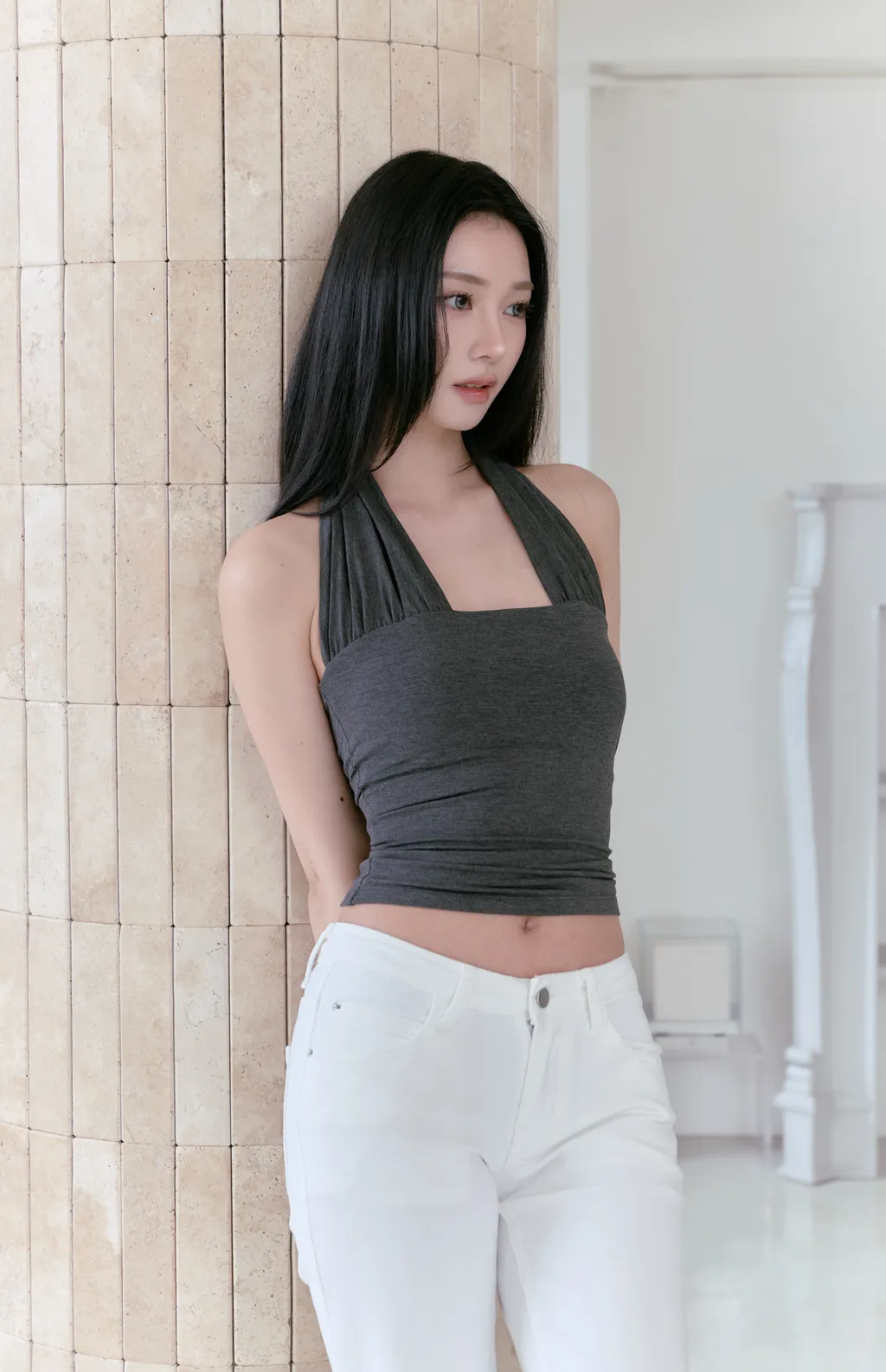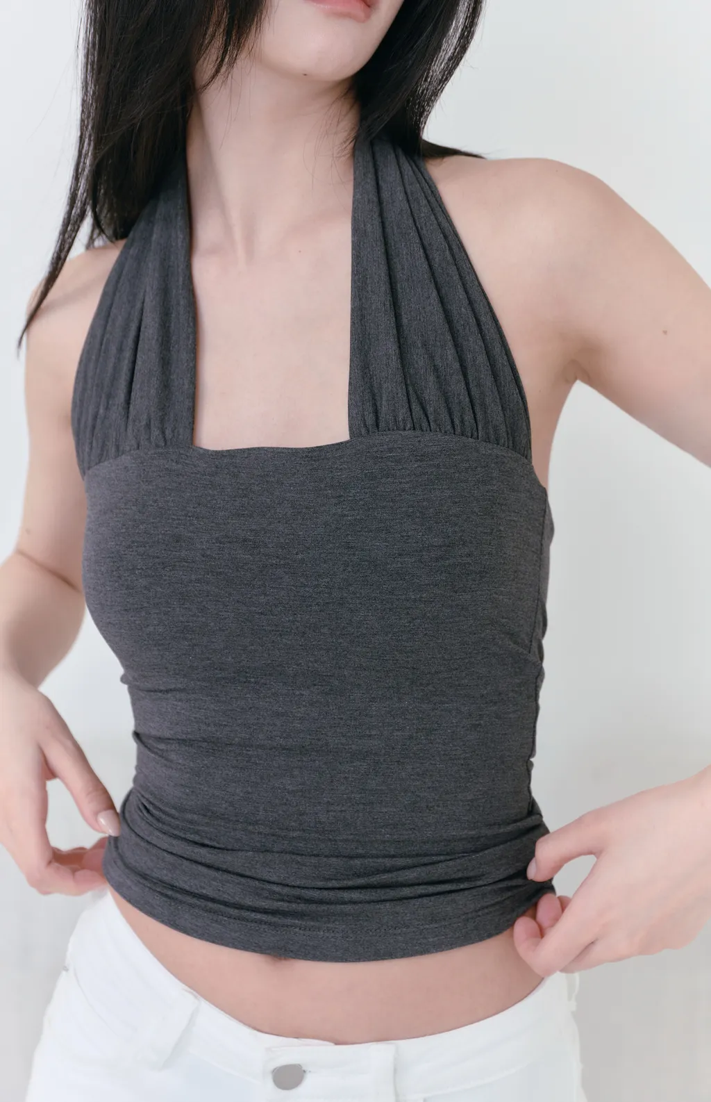 Drape Halter|掛脖寬褶肩帶修身短版上衣-深灰色