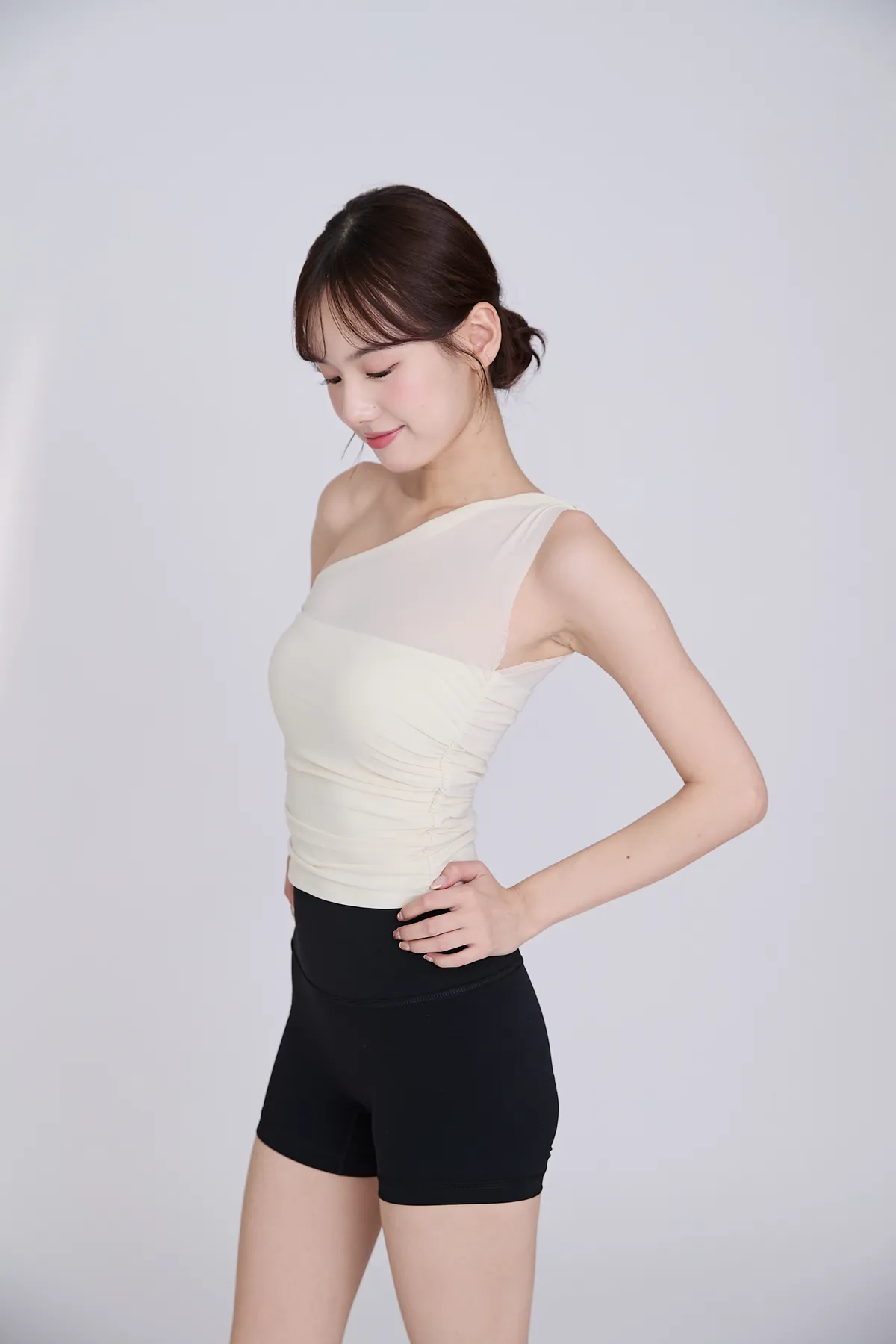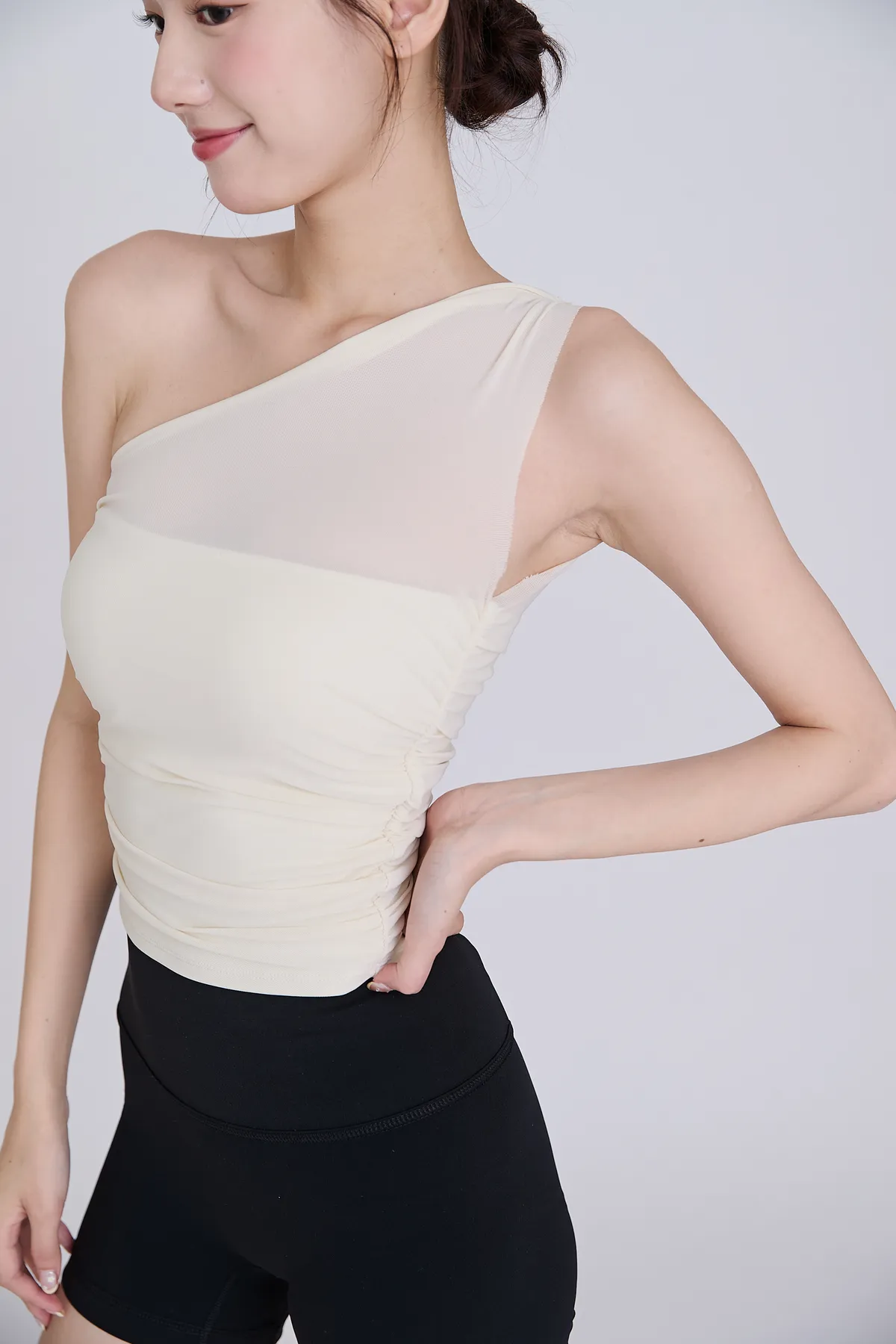 單肩網紗美背摺皺瑜伽上衣-象牙白氣質單肩扭結設計 巧妙修飾鎖骨線條