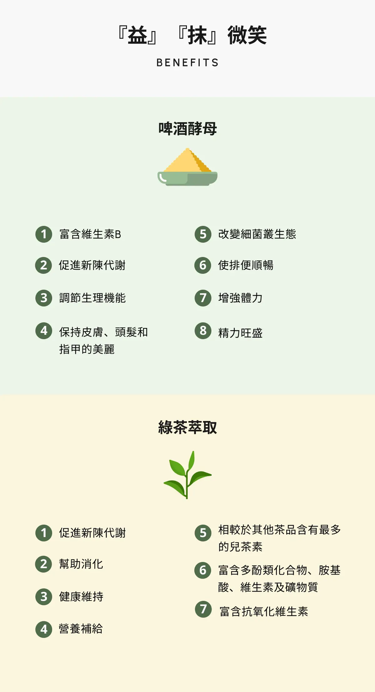 🌟 關鍵成分:綠茶萃取/啤酒酵母/菊苣纖維/進口蛋白