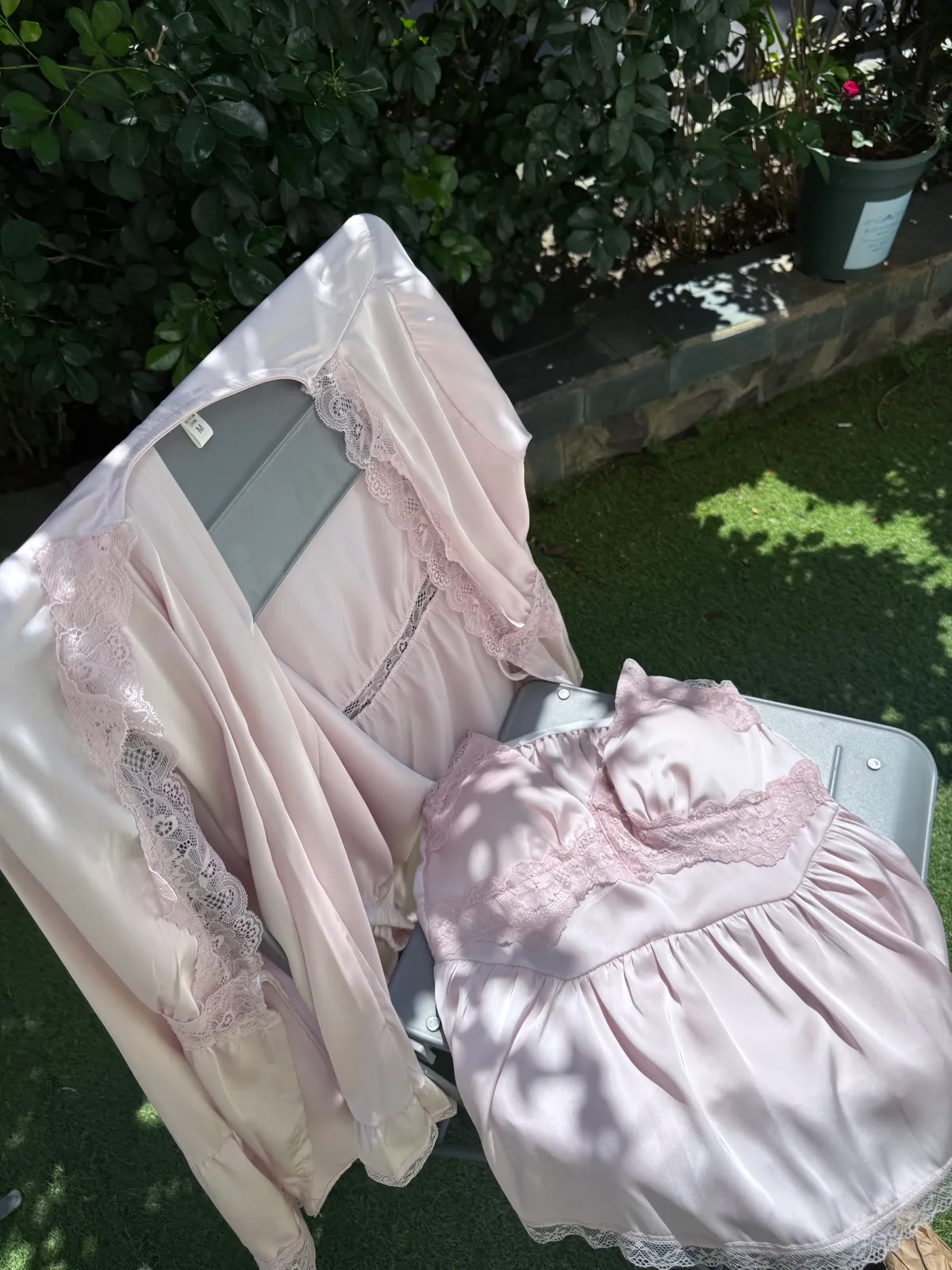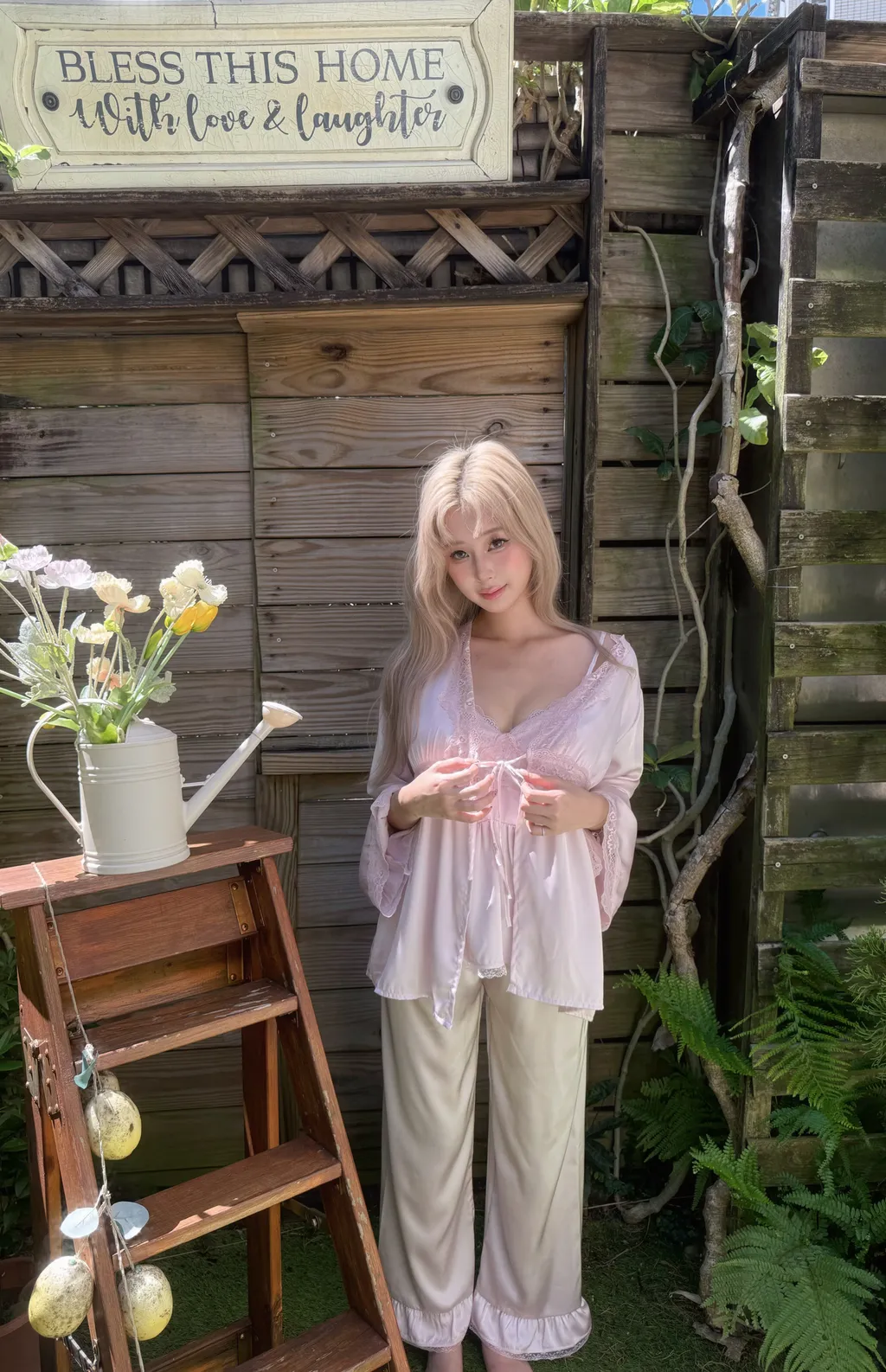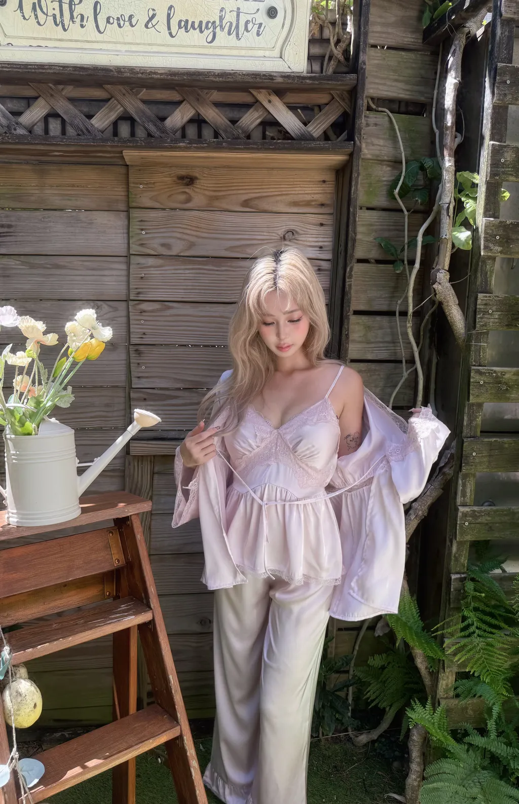 Velvet Night|微醺儀式感 蕾絲緞面性感三件式外罩睡衣-淡粉色可調節肩帶,自帶可拆卸式胸墊顯瘦 V 型領口蕾絲小背心,搭配同色長袖罩衫細膩蕾絲輕觸肌膚,展現低調性感與優雅氛圍三件式居家套裝,絲緞的柔順與蕾絲的浪漫交織讓夜晚時光更添溫柔與儀式感顏色:黑色、奶油白、淡粉色尺寸:M、L (手工測量,誤差±3cm皆正常範圍)(商品皆為實拍,與原色差異極小,室內光與戶外陽光顏色下略有些微差異,特殊色每個人認知能力不同,請三思後下單)