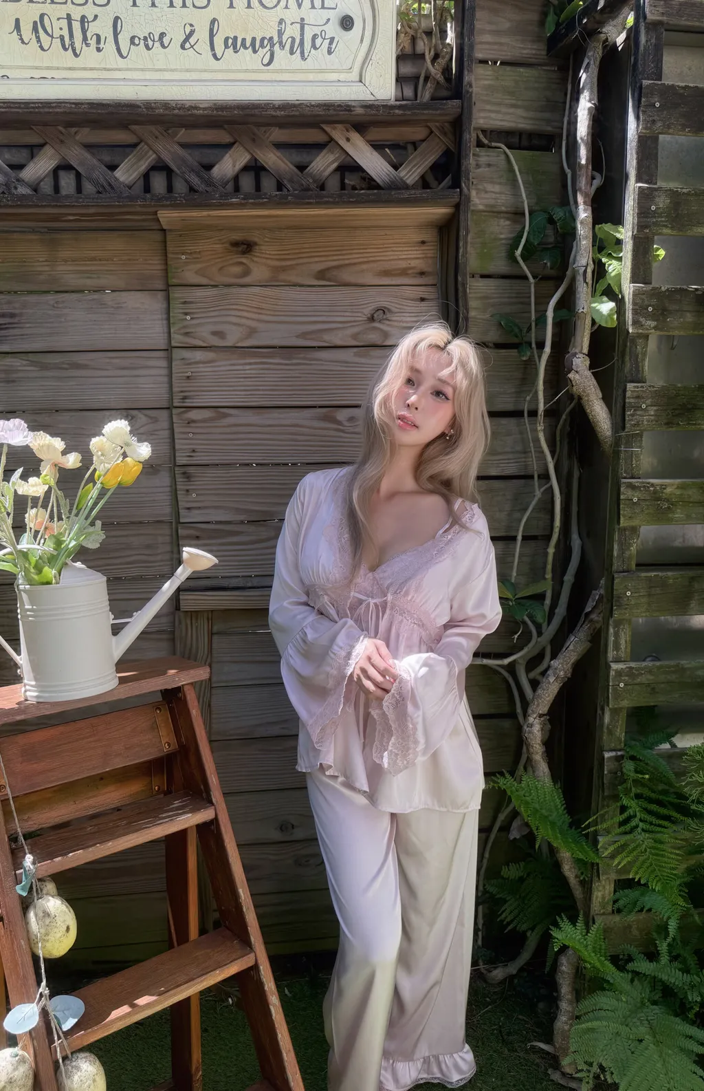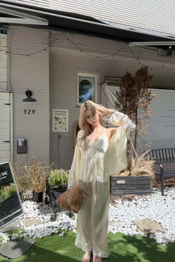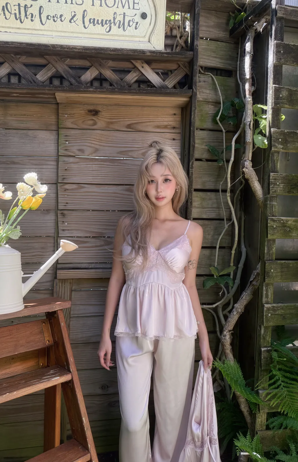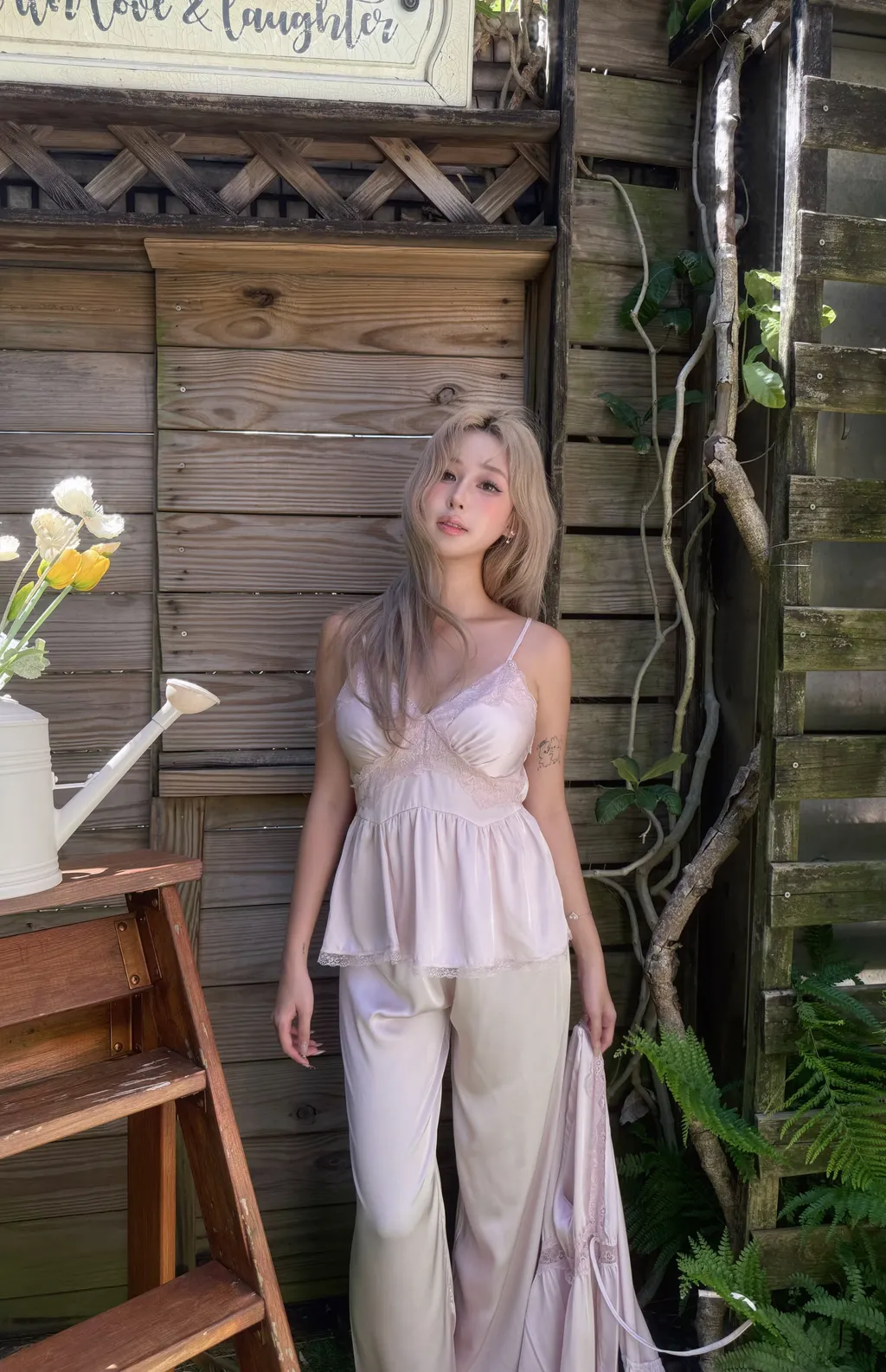 Velvet Night|微醺儀式感 蕾絲緞面性感三件式外罩睡衣-淡粉色可調節肩帶,自帶可拆卸式胸墊顯瘦 V 型領口蕾絲小背心,搭配同色長袖罩衫細膩蕾絲輕觸肌膚,展現低調性感與優雅氛圍三件式居家套裝,絲緞的柔順與蕾絲的浪漫交織讓夜晚時光更添溫柔與儀式感顏色:黑色、奶油白、淡粉色尺寸:M、L (手工測量,誤差±3cm皆正常範圍)(商品皆為實拍,與原色差異極小,室內光與戶外陽光顏色下略有些微差異,特殊色每個人認知能力不同,請三思後下單)